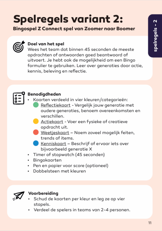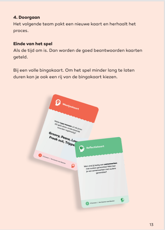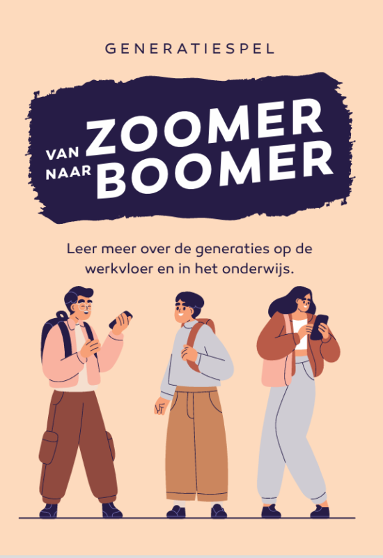Het generatiespel Van Zoomer naar Boomer slaat een brug tussen jongeren en oudere generaties. Jongeren maken op een interactieve, laagdrempelige manier kennis met de normen, waarden en ervaringen van eerdere generaties. Door doen, denken en reflecteren krijgen zij meer inzicht in zichzelf én in de wereld van werk — een waardevolle voorbereiding op stage en toekomstig werk
